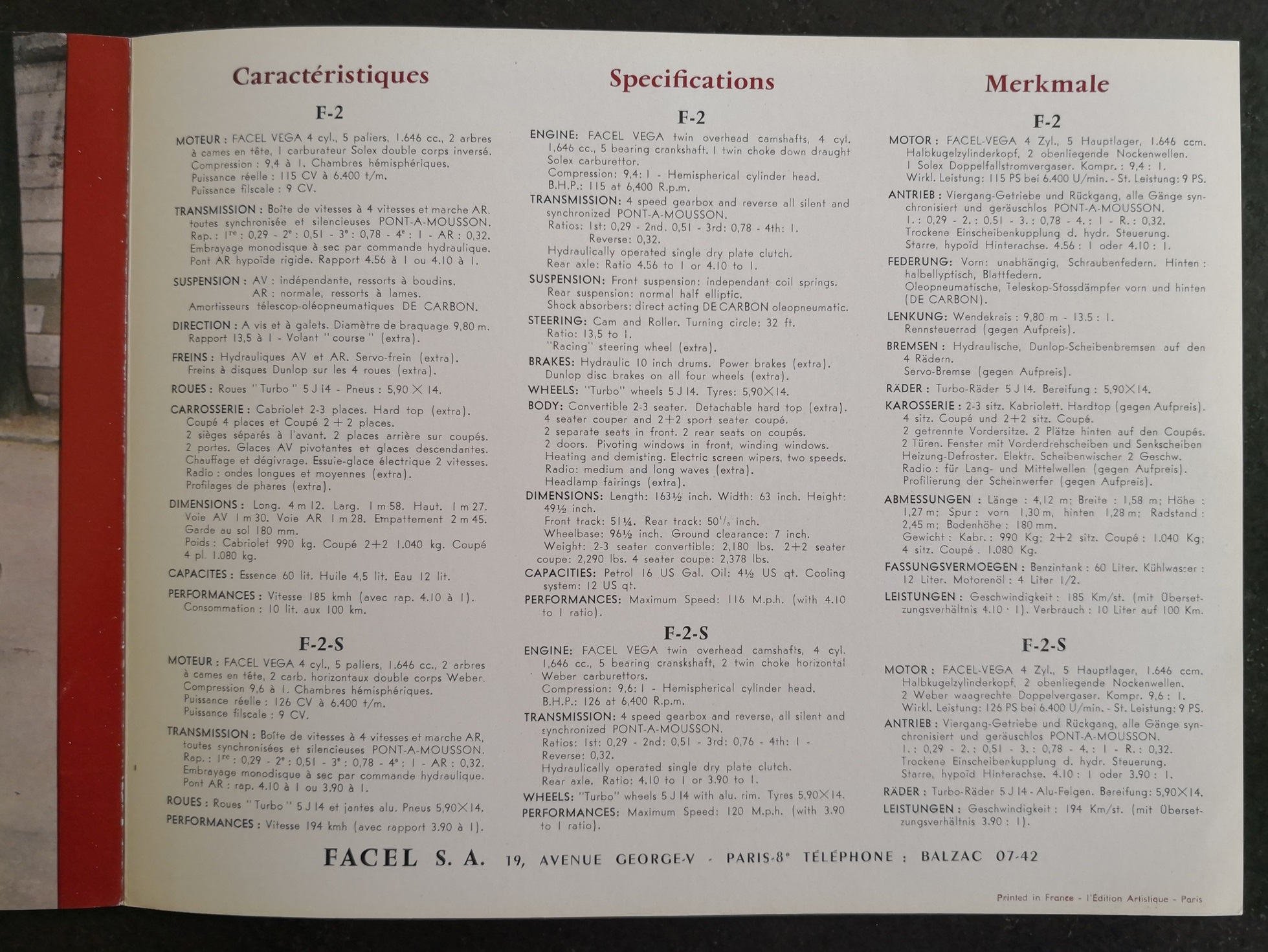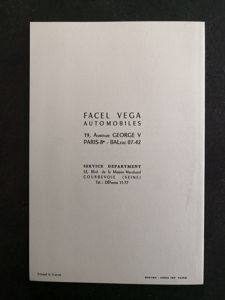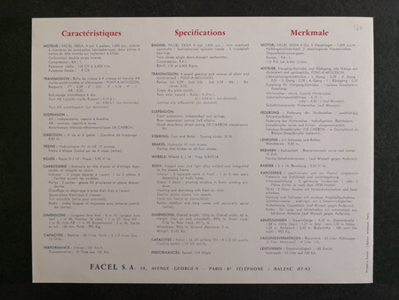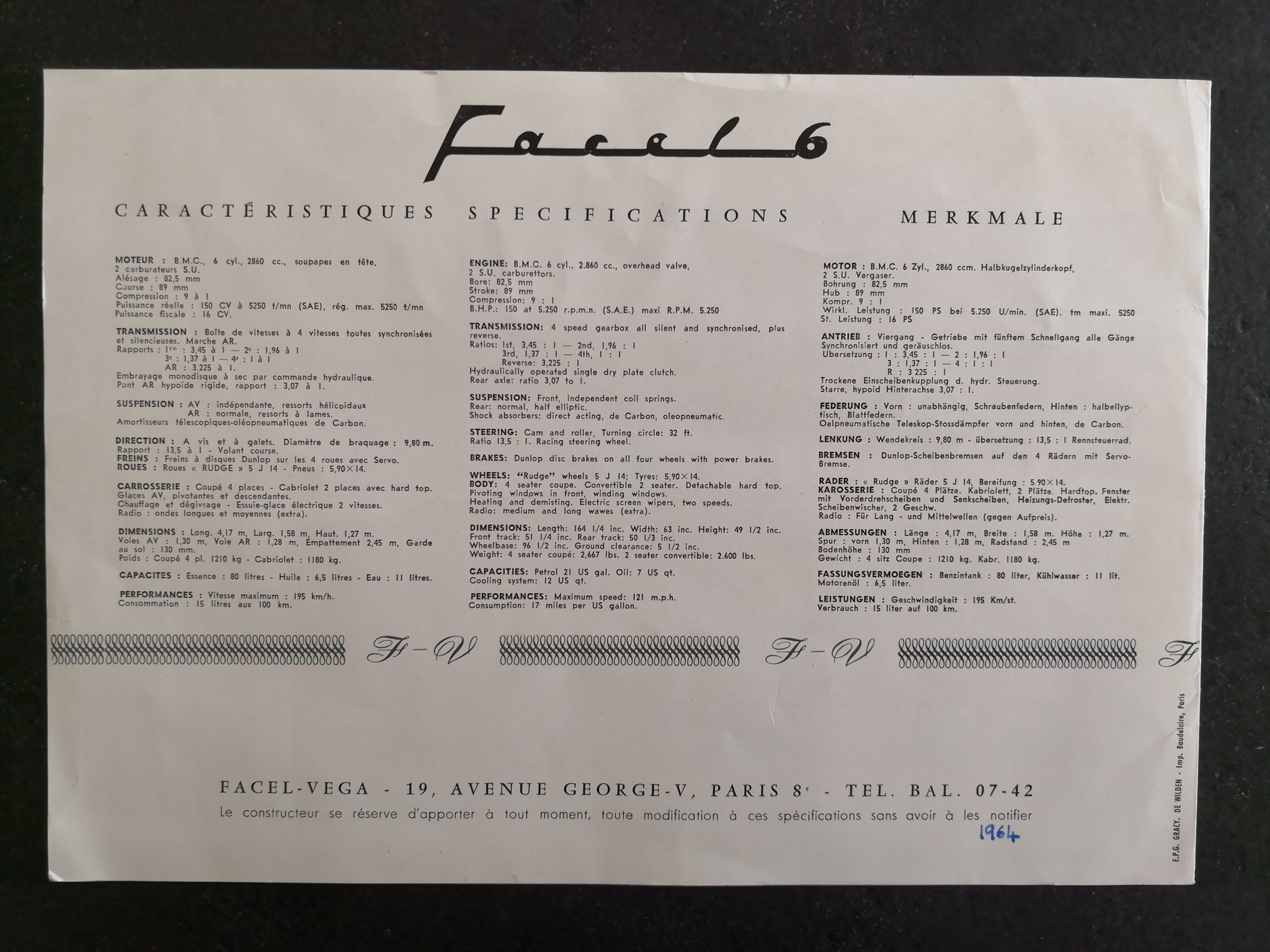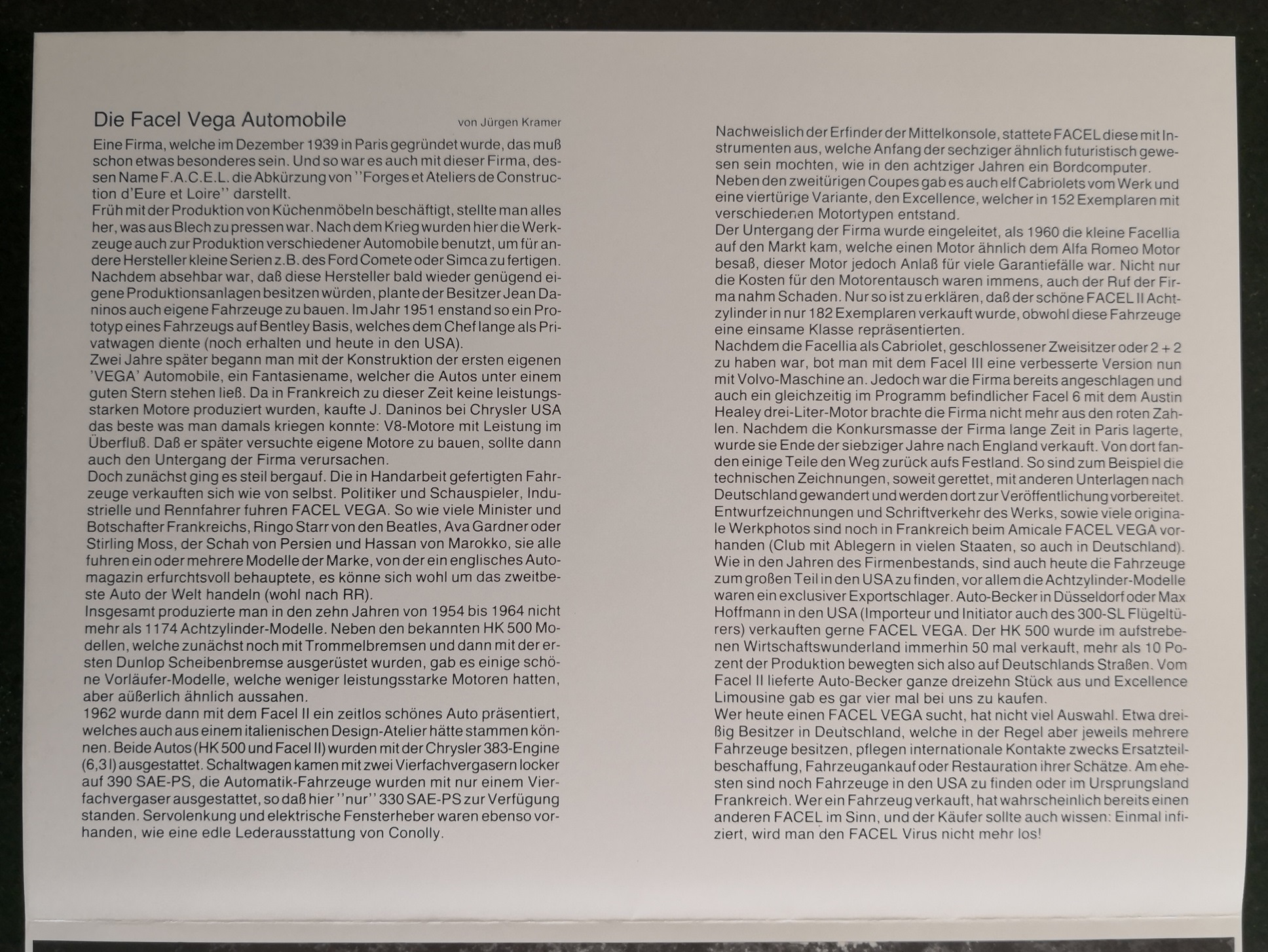 Hier zeige ich die Prospekte aus meiner eigenen Sammlung, die ich gerade verkleinere, wertvolle Dokumente aus der Produktionszeit dieser herrlichen Automobile. Ergänzt werden die Originalunterlagen durch das Register aller Facel Vega Fahrzeuge von Hans Ruhé aus dem Jahr 1990 sowie ein Faltblatt von Dr. Jürgen Kromer mit Informationen zur Marke aus dem Jahr 1992/93.