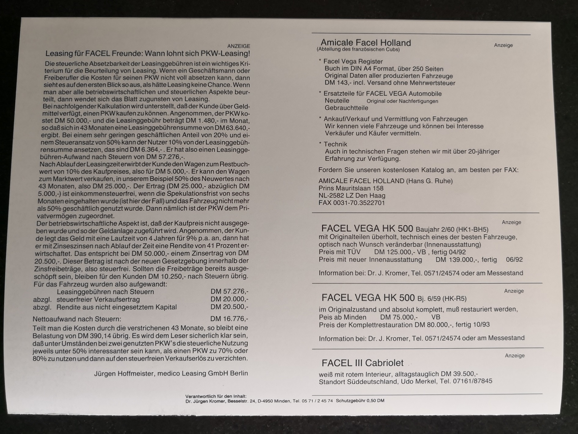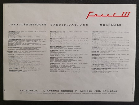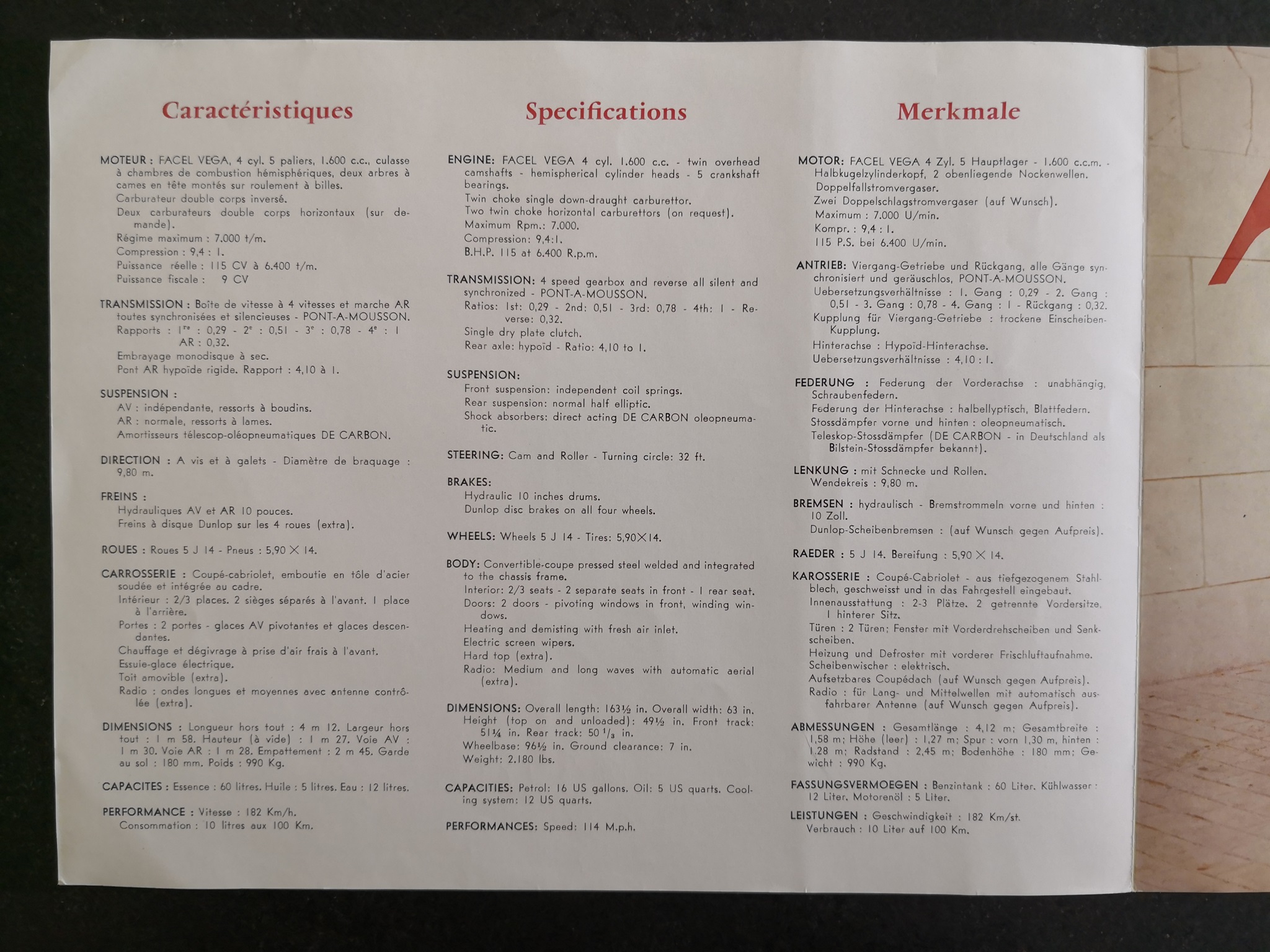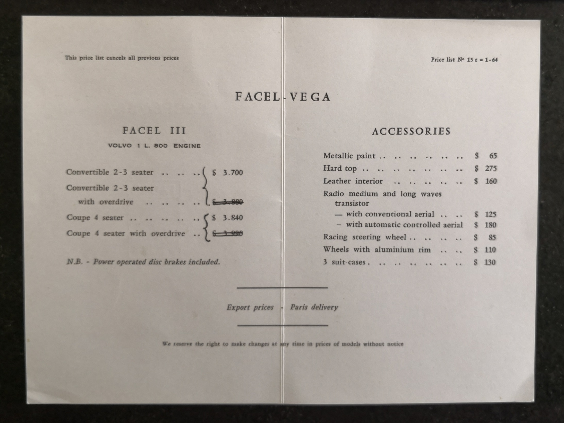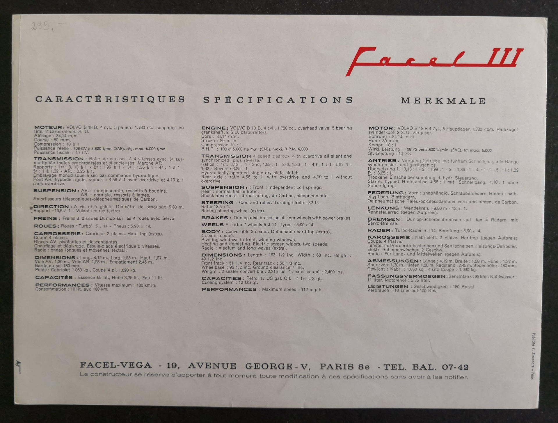 Hier zeige ich die Prospekte aus meiner eigenen Sammlung, die ich gerade verkleinere, wertvolle Dokumente aus der Produktionszeit dieser herrlichen Automobile. Ergänzt werden die Originalunterlagen durch das Register aller Facel Vega Fahrzeuge von Hans Ruhé aus dem Jahr 1990 sowie ein Faltblatt von Dr. Jürgen Kromer mit Informationen zur Marke aus dem Jahr 1992/93.